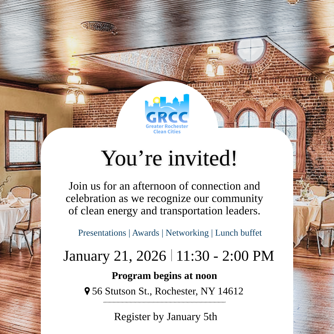 Greater Rochester Clean Cities (GRCC) invites community partners, clean transportation leaders, and regional innovators to attend and support our annual event celebrating progress toward a cleaner, more sustainable transportation future. Program and awardees to be announced.
